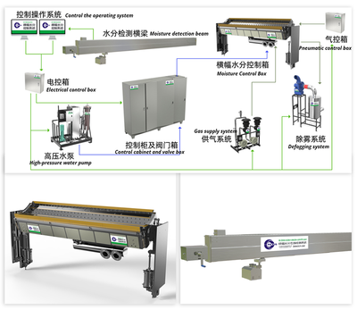FOCUS PAPER MACHINE - Moisture Control System uniformly humidifies the paper web while delivering an optimal cross-machine moisture profile. By humidifying one side of the paper web, it effectively minimizes longitudinal ridging. Additionally, after web breaks or during startup following grade changes, it enables faster production of qualified paper. While enhancing paper quality, it simultaneously improves the winding performance of the rewinder, thereby reducing trim loss. It also allows the paper to achieve higher moisture content or faster machine speeds at the winding section (suitable for paper machines with a maximum speed of 1500 meters per minute and a maximum web width of 8.5 meters).
